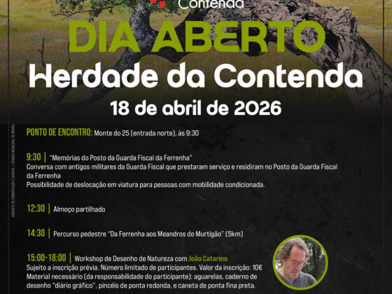 Dia Aberto da Herdade da Contenda – 18 de abril https://www.herdadedacontenda.pt/wp-content/uploads/2026/04/Dia-Aberto-2026-scaled.jpg 1810 2560 Herdade da Contenda https://www.herdadedacontenda.pt/wp-content/uploads/2026/04/Dia-Aberto-2026-scaled.jpgA Herdade da Contenda realiza, no próximo dia 18 de abril de 2026, mais uma edição do seu Dia Aberto com um conjunto de atividades dedicadas ao património, natureza, convívio e participação ativa na conservação ambiental. O encontro tem início às 9:30, no Monte do 25 (entrada norte), com a…