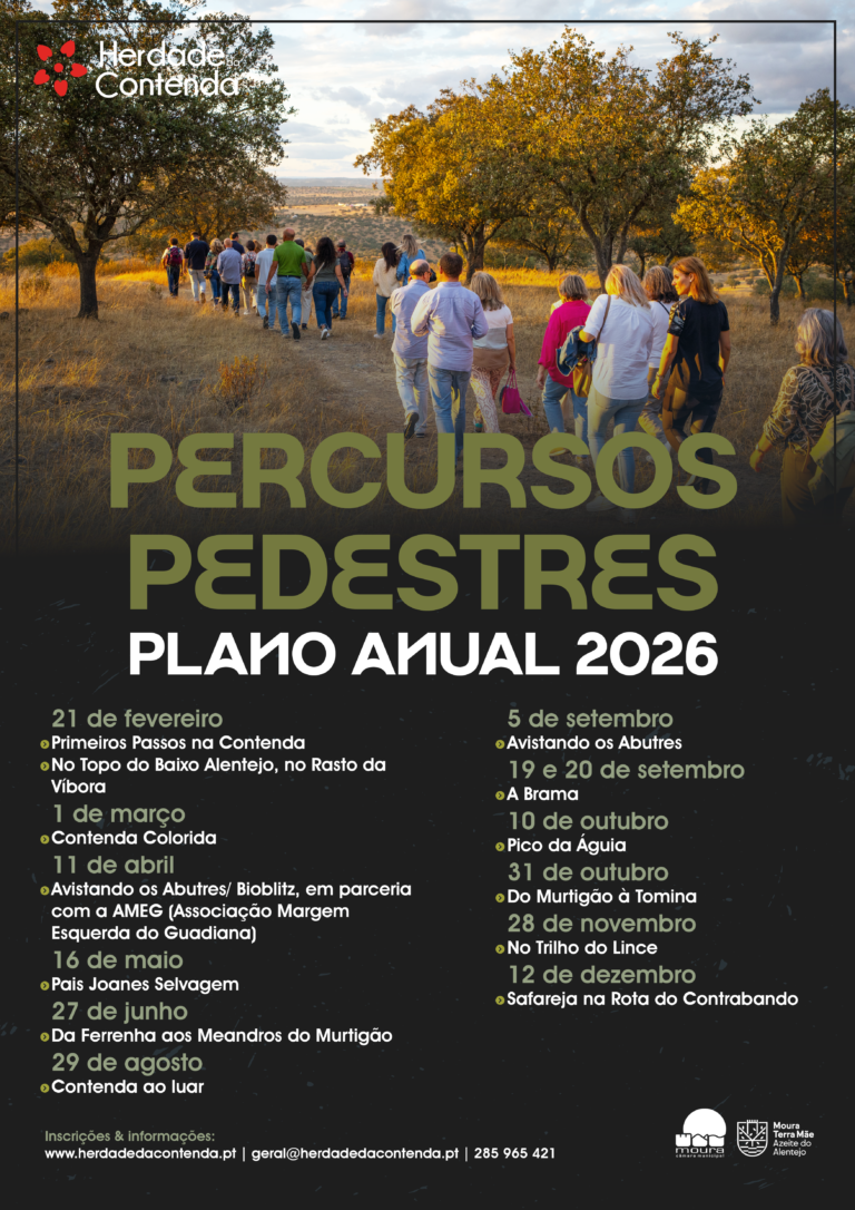 Estes percursos pedestres guiados e temáticos conjugam paisagens naturais com memórias locais, promovendo a descoberta da biodiversidade e dos valores históricos e identitários da Herdade da Contenda. A iniciativa pretende proporcionar experiências diferenciadoras, aliando fruição da natureza, conhecimento científico e interpretação patrimonial.